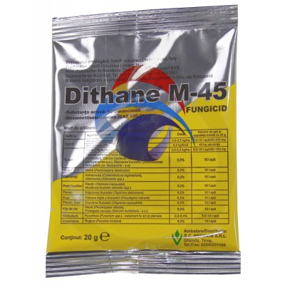 Fungicid Dithane M 45 este un fungicid de contact, ce are ca substanta activa mancozeb 80%. Fungicidul Dithane coombate un spectru larg de agenti patogeni in urmatoarele culturi: legumicultura, floricultura, pomicultura , vita de vie , dar are actiune si la tratamentul aplicat semintelor.