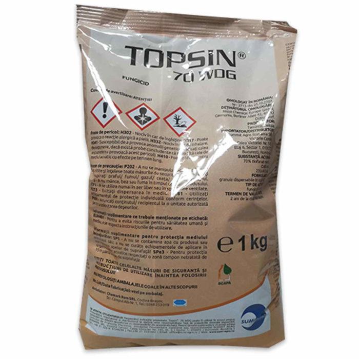 Topsin 70 WDG este un fungicid sistemic cu o excelenta actiune preventiva si curativa, cu spectru larg de actiune, asigurand combaterea cu succes a fainarilor, putregaiurilor umede si uscate, a rapanului si patarii frunzelor din principalele culturi.